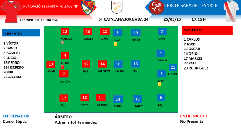 El partido que enfrentaba al Terrassa contra el Cercle, comenzó con dominio de los locales, mientras que sus rivales esperaban en el medio del campo. Los de Terrassa dispusieron de tres clarísimas ocasiones de gol, la primera el las botas de Manato que controló un balón dentro del área con el pecho, pero su chute se fue fuera. La segunda en las botas de Adriá, que tras un gran pase al hueco de un medio dejó sólo al jugador, pero con el portero batido chutó fuera. Y la tercera también en las botas de Adriá una jugada calcada a la anterior con el mismo resultado. En el minuto 37 el Terrassa se quedó con diez por la expulsión del central Aitor que le da una patada a Ignasi sin balón y cuando tenía al colegio delante de él. En el minuto 44 llegó la primera ocasión de los de Sabadell en las botas de Ignasi, pero su chute fue repelido por Jaume portero del Terrassa. Al descanso se llegó con empate a cero.