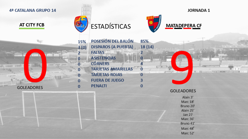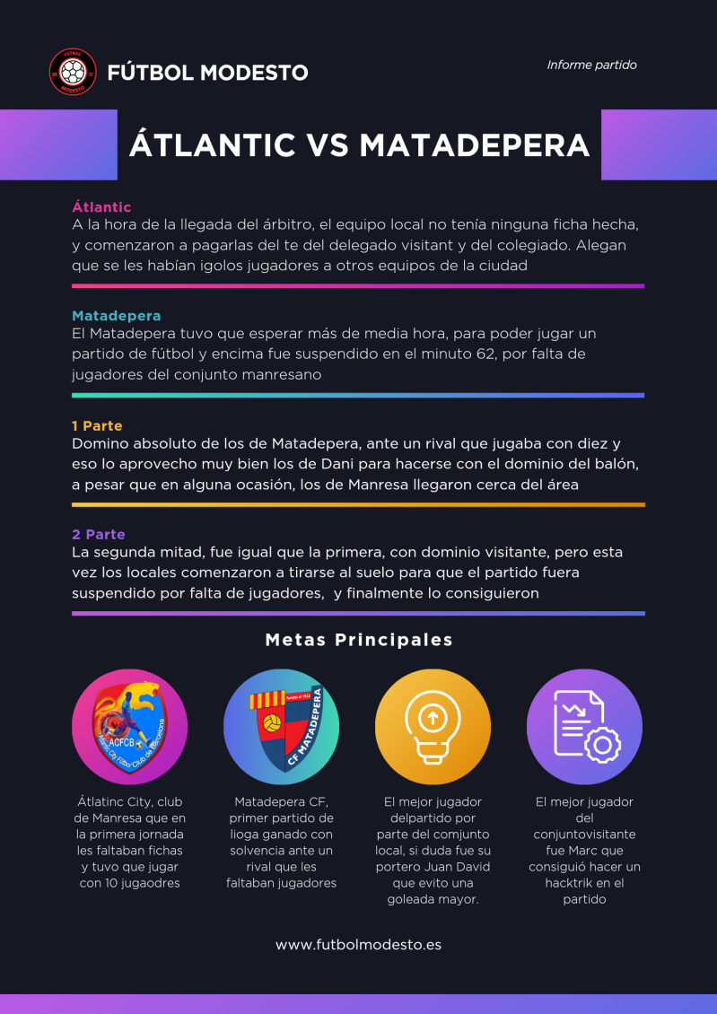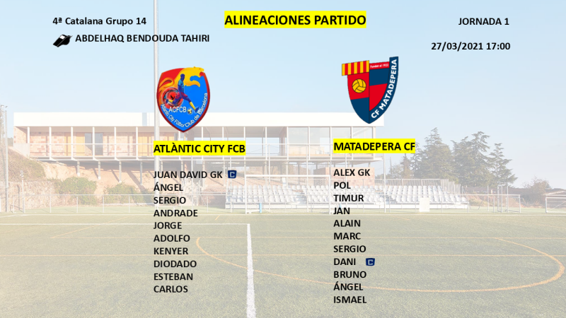 En el día de hoy, se ha disputado la primera jornada de 4ª Catalana Grupo 13, que enfrentaba al Atlàntic y al Matadepera. En un partido algo extraño, ya que comenzó 30 minutos tarde de la hora, y terminó siendo suspendido en el 62' por falta de jugadores del conjunto local.