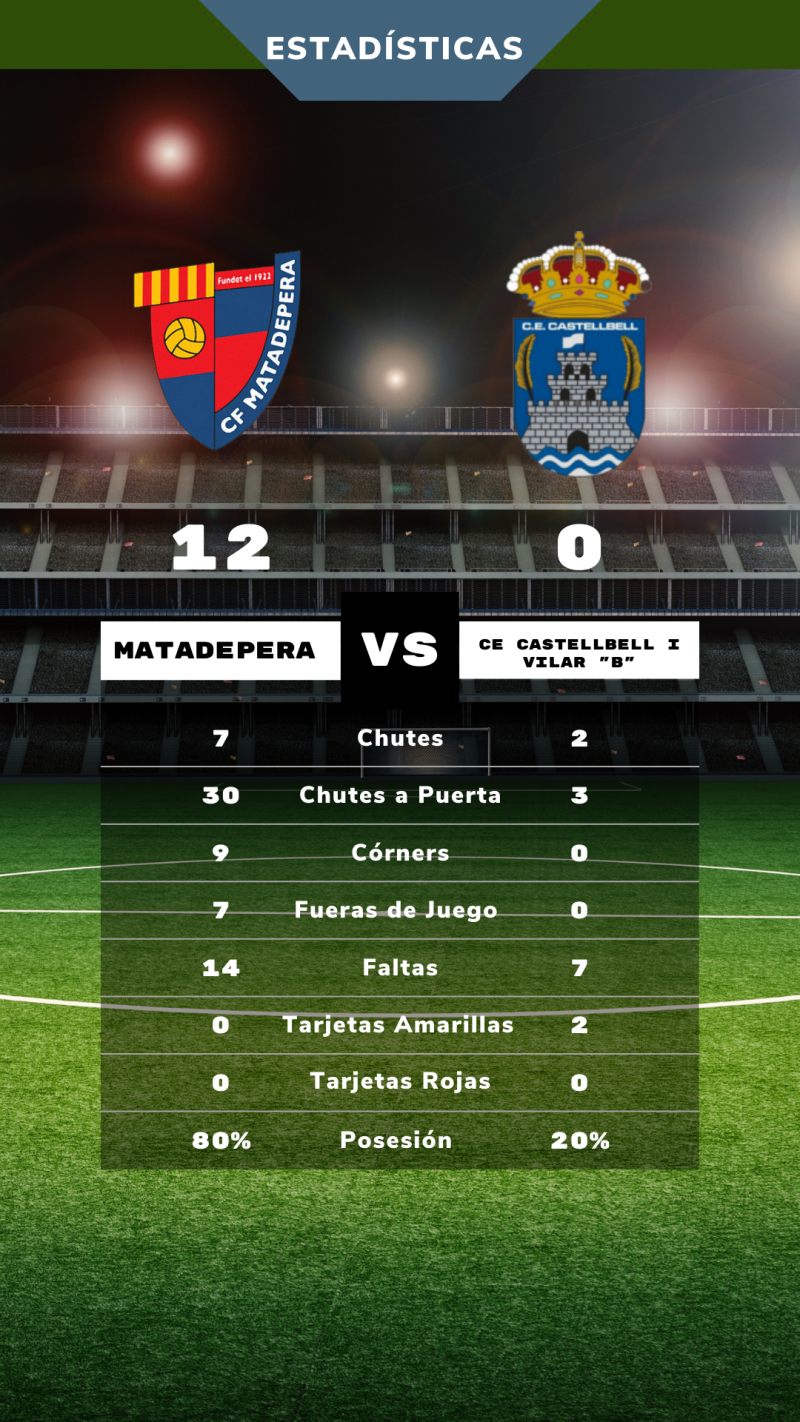 La segunda mitad comenzó muy bien para los locales,vaya que en el minuto 46 Chicha marcó el sexto, tras un pase de Riado al 2º palo. Minutos más tarde, Toni estuvo muy cerca de marcar, pero su disparo se fue mansamente a las manos de Sergi. En el minuto 54, en un pase perfecto de Chicha, fue aprovechado por Bonovila para marcar. Las ocasiones de los matadeperenses llegaban una tras otro, sin que sus rivales pudieran hacer nada para evitarlo. Los de Dani que siguieron atacando, vieron como los goles iban llegando uno tras otro. Los goleadores fueron: Toni de cabeza, tras un lanzamiento de esquina, Soufiane que marcaba en propia puerta, Soufiane que volvía a marcarse en propia, Marc que recuperó un balón en el córner y consiguió batir al portero por bajo y Ángel que se encontraba sólo en el interior del área y consiguió batir al portero por el palo largo.
