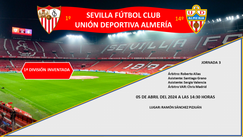 En el día de hoy, en el Ramón Sánchez Pizjuan, hemos visto el partido correspondiente a la Jornada 3 de nuestra 1ª División Liga inventada, que enfrentaba al Sevilla y al Almería, en un encuentro que se acabó la emoción en el momento que el Sevilla consiguió adelantarse en el marcador.